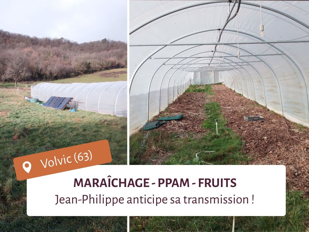Jean-Philippe, maraîcher depuis 7 ans à Volvic (63), exploite une parcelle d’un hectare en maraîchage, et le reste est laissé à un centre équestre qui l’entretient en mettant des chevaux. Le terrain, orienté nord-sud, est situé au pied d’une colline couverte de forêt, et est entouré de haies. Le sol est profond et très riche (argilo-limoneux dépourvu de cailloux). Jean-Philippe travaille selon les principes du Maraîchage sur Sol Vivant (MSV) sans aucun travail du sol et avec apports abondants de Matière Organique (foin, BRF, paille, feuilles). Deux serres et une tiny house sont présentes sur la parcelle.